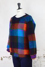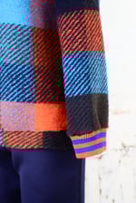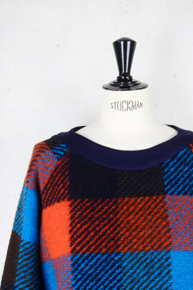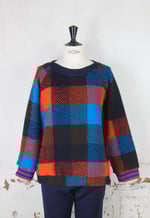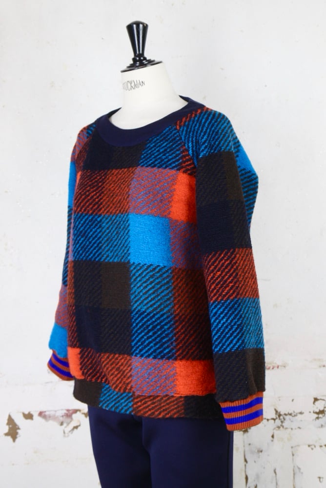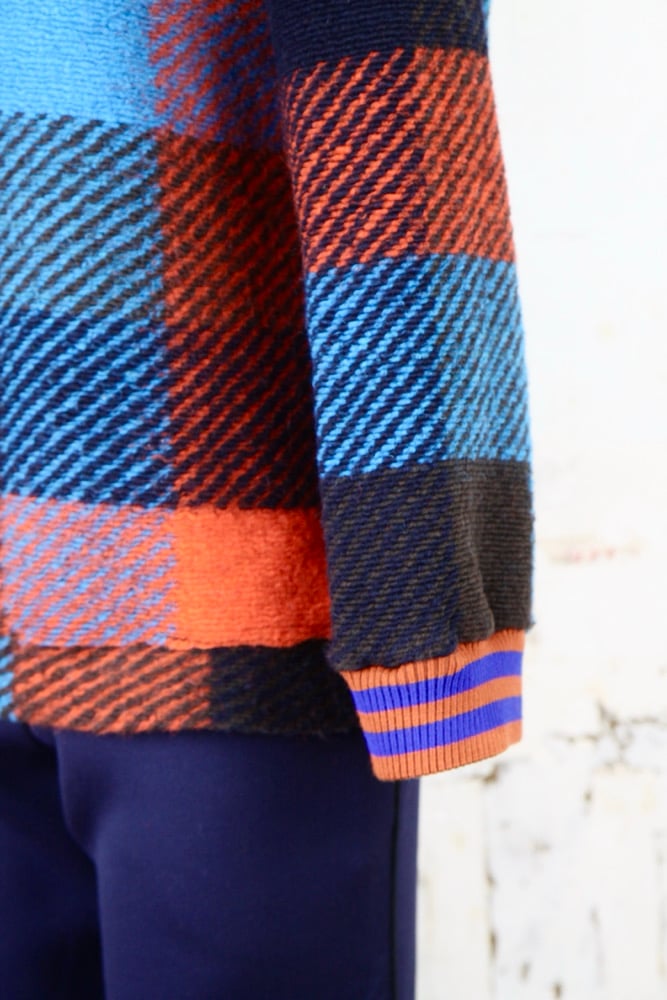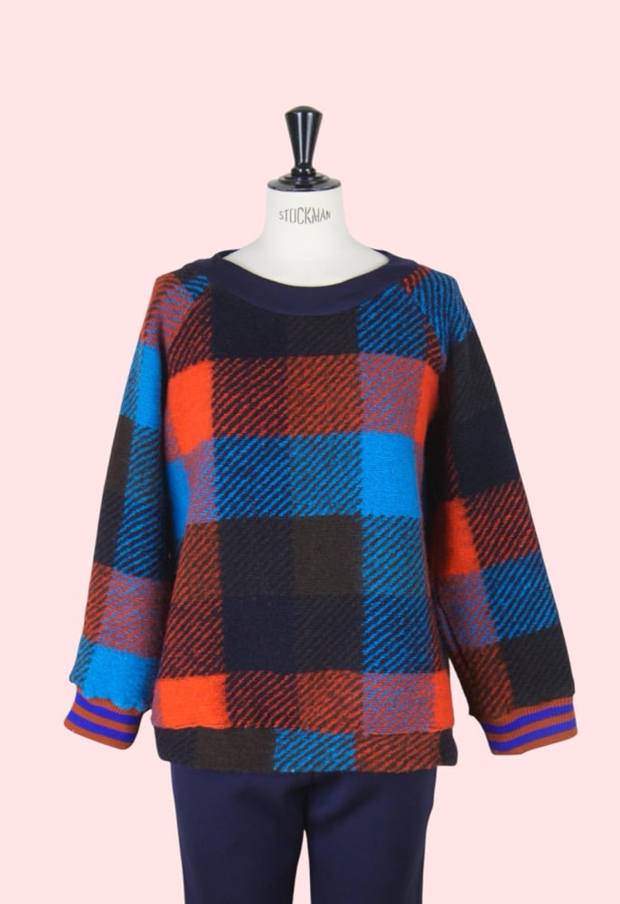 Encolure en tissu contrasté marine et bord côte aux poignets.