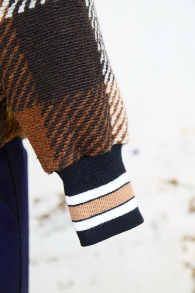 Encolure en tissu contrasté marine et bord côte aux poignets.